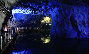 翟山坑道位於金門西南方,一進入坑道內即可感受它的震撼力!靠著新架設的欄杆,望著深遂的倒影,是多少人流血流汗才可建造出如此偉大的工程?翟山坑道為一A字型戰備水道,總長約357公尺,民國五十二年為因應戰爭所需而開挖,主體是由花崗岩石,坑道皆由人工一鑿一斧開鑿而成。