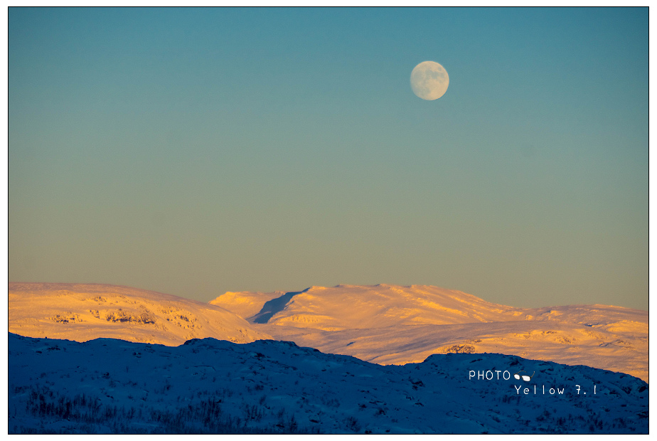 好吧,反正都來了,索性也跟著一起去,大約30分鐘的車程來到山丘上,天空萬里無雲視野更加良好~月光把雪地照耀得像是白天,都到這裡了,架好相機拍了幾張剩下的就是等了,看極光的小訣竅,先找到北斗七星~就可以找到北極星,然後就望著那個方向慢慢等~因為極光都會從北方出現。