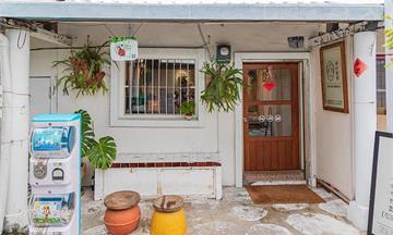 店門外小小的招牌也很有感覺,簡約刷白的木門感覺還滿文青的,老闆也擺放好幾盆植栽做裝飾。