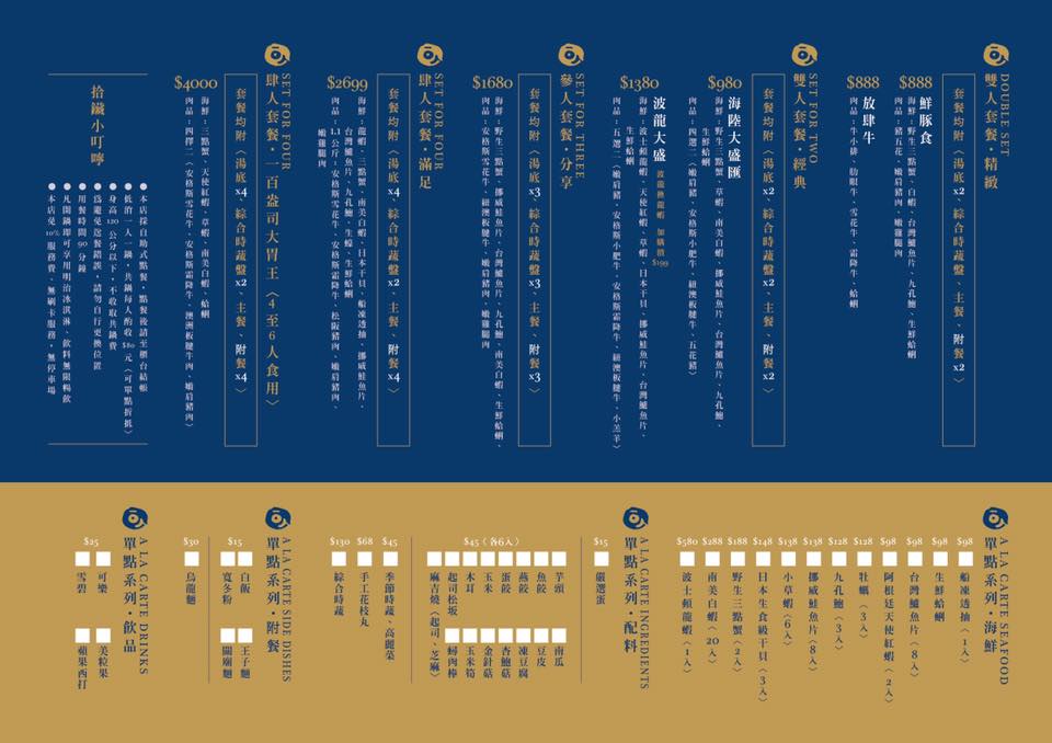 如果是多人聚餐,依人數多寡有提供不同的套餐,價格與套餐內含餐點都標示得很清楚,有特別喜歡的餐點可以另外在下方單點~