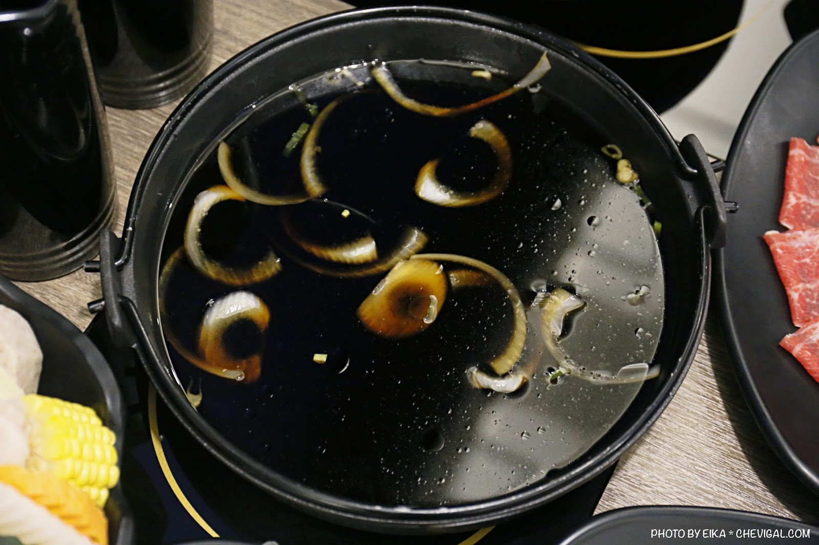 柚柚點的是壽喜鍋,可以很明顯地看到有加入不少洋蔥下去一同熬煮。雖然我們平常不愛吃壽喜鍋,因為普遍壽喜鍋的口味都偏死甜,不過拾鑶的湯頭真的很不錯,一開始可以喝到洋蔥特有的甘潤清甜,尾韻後端會慢慢自然帶出醬油的鹹香,比較不易覺得膩口。