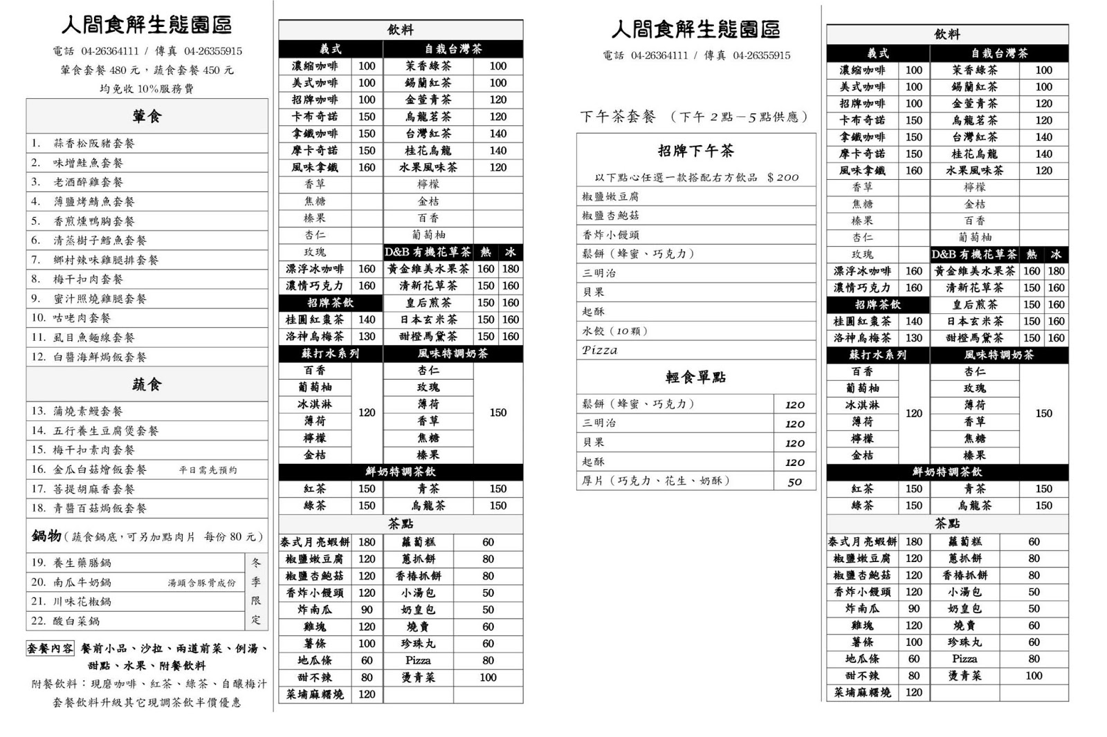 餐點有正餐與下午茶可選擇,葷食套餐一律480元,素食則為450元,不另收服務費。套餐內容含有餐前小品、沙拉、兩道前菜、例湯、甜點、水果與附餐飲料。