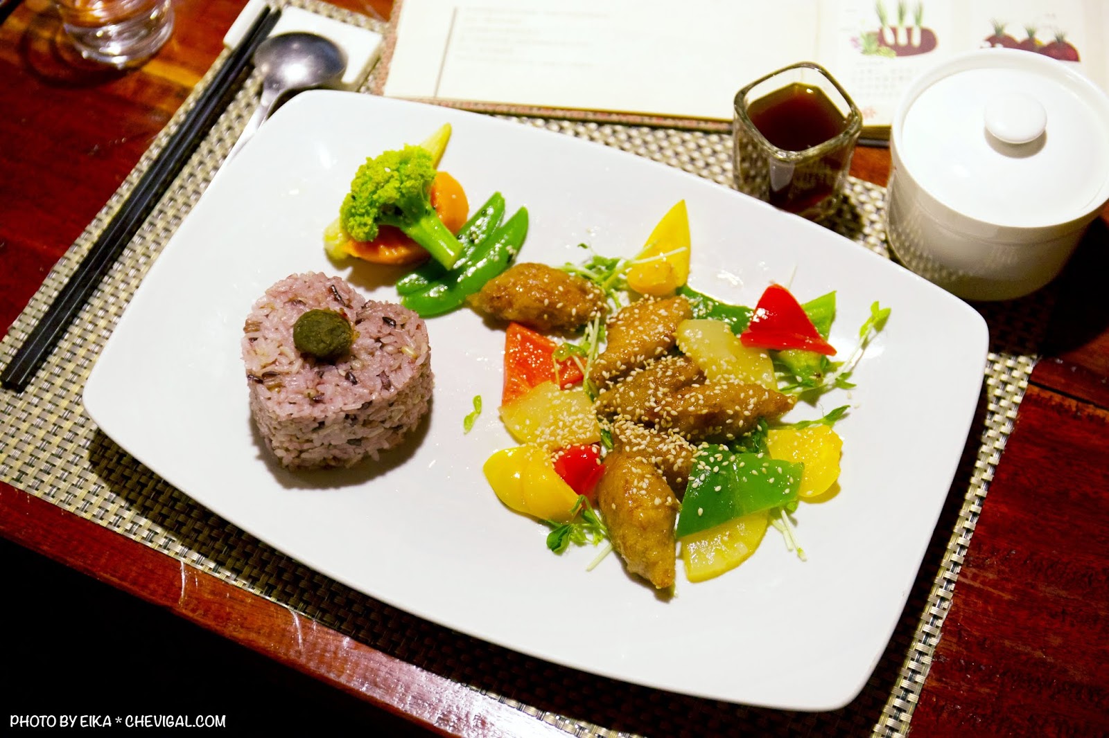 除了套餐常見的沙拉與前菜外,這裡還貼心地附有暖胃菜:藜麥小米粥、龍鬚鳥蛋佐花生醬、五香豆乾與醃蘿蔔,中式的餐點風格雖然看似樸實無華,但卻意外地頗有飽足感。
