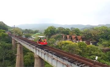 從勝興車站穿越2號隧道,串接8個隧道結合三義130沿線週邊景點,路線為路線為勝興車站→2號隧道→魚藤坪橋→6號隧道北口折返,來回往返約12公里,每趟大約需耗費1.5小時,兩車間距必須超過5公尺,4人座的軌道自行車,除人力踩踏,另附設電動設備,不怕累了騎不動,另外還有衛星定位系統告訴遊客身在哪裡。