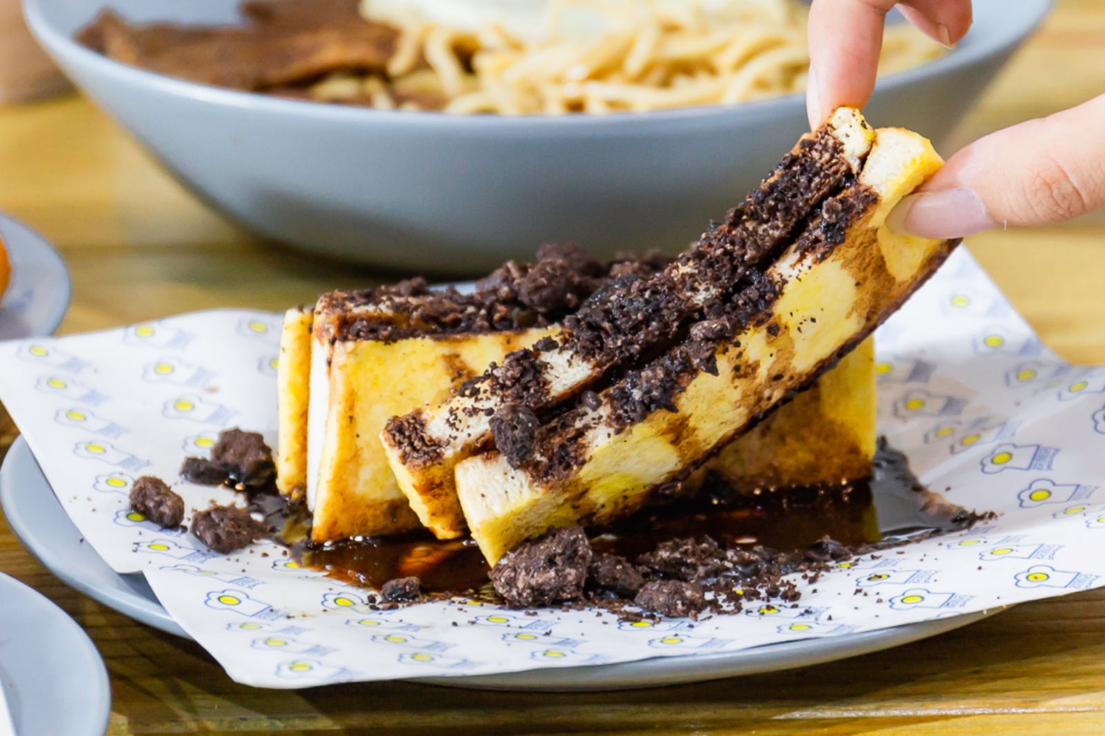香甜的法式吐司表面撒上OREO碎片,再沾取底部的巧克力醬,就是一份簡單好吃的甜點。不過這款的甜度較高,柚編說他很愛OREO碎片,但是巧克力醬的甜度真的無法,後來魚編就直接開心地接收啦~