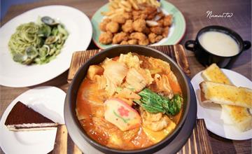 拿起菜單閱讀了一下,發現義起吃麵的餐點十分豐富,有義大利麵、燉飯、即時火鍋、鍋麵(麵疙撘)、披薩(含脆薯+雞塊)、點心、兒童餐、甜點…等可選擇,最特別是義大利麵醬料更是多元化,包括有白醬、紅醬、青醬、黃金泡菜、咖哩醬、韓式辣炒,加起來約有6種自製醬料,價格平均落在140元~200元之間,不收一成服務費,老實說以義大利麵來說140元價格,有冰淇淋、飲料無限暢飲,我覺得價位很親民也很實在,另外如果擔心吃不飽,沒關係還可以升級套餐,NANA最愛義起吃麵升級套餐選項,因為只要加購價,就可以多濃湯、麵包..等等多樣組合,光是組合價就有5種可選,份量十足讓你吃飽飽的回家。