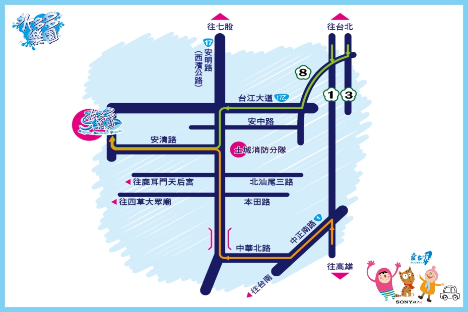 交通路線:(請參考下圖) 中山高→下永康交流道,往台南方向→中正南路→右轉中華北路→右轉安明路→左轉安清路(到盡頭即可到達) 南二高→轉國道8→往台南方向至高速公路盡頭 中山高→安吉路→右轉安中路三段~六段→左轉安明路→右轉安清路(到盡頭即可到達)