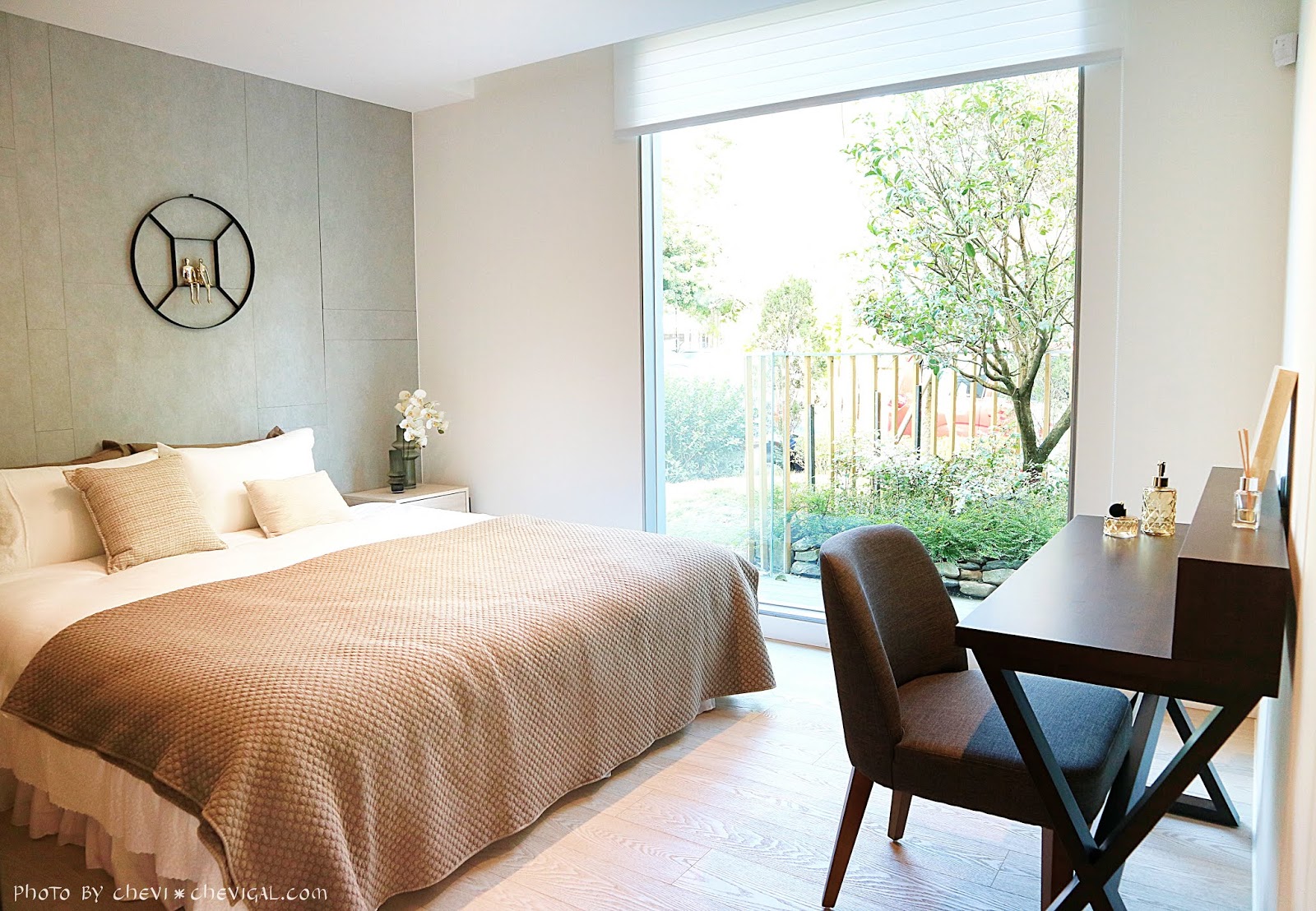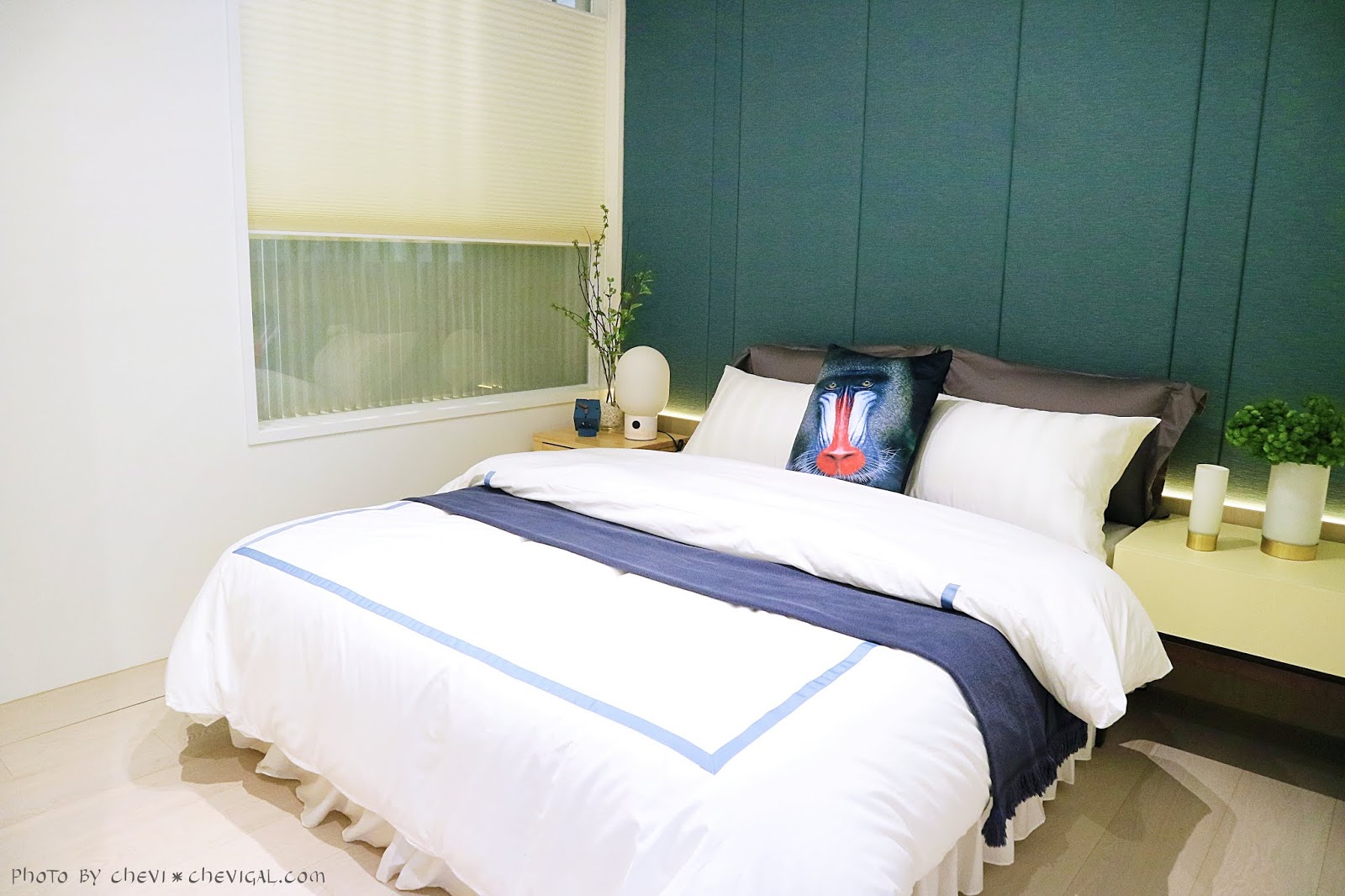 主臥室有著絕佳的自然採光,在好天氣時即使白天不開燈,室內的亮度依然相當足夠。整體坪數寬敞不擁擠,不但放得下整張加大版雙人床與床頭櫃,另一側還能設置整牆式的衣櫃。