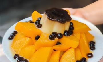 但選用的是正港欸愛文芒果,再精心擺盤慢慢堆疊起芒果六芒星,最後登頂處一顆滑溜可口的布丁,點綴上珍珠,整體相當生動,雖然價錢不可愛但也還是會買單。