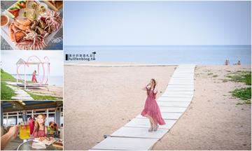 順著導航指引,開到這片森林與大海之前,把車放在停車場,大家踩上了金黃色的【隘門沙灘】,沿途的海岸線即便在陰天之下還是好漂亮,這裡的沙子細軟柔白,玩玩沙盪盪鞦韆就半個小時過去,欸不是,我們明明要來【及林春咖啡館】喝咖啡的阿?!