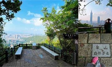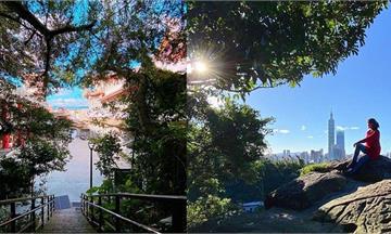 沿著步道繼續前行,茂密的林木搭起一座綠色廊道,不只提供遮蔭,也有蟲鳴鳥叫相伴,一路跟隨的還有偶而露臉的陽光和101大樓,漫步其間不只身心全然放鬆,還享受一段不受打擾的靜謐,步履也變得越來越輕盈,不知不覺就來到第二處裸岩,這簡直就是天造地設的戶外攝影棚,而主角正是先前如影隨形的101大樓。