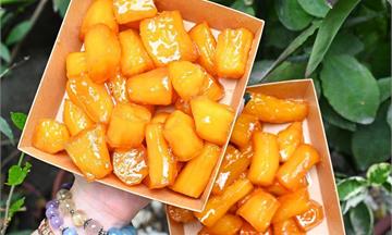 蜜藏地瓜的蜜糖地瓜是採用麥芽糖下去熬煮成焦糖色澤,地瓜都是手工現切,所以大小都不太一樣,瞧瞧每塊地瓜上色都非常均勻,地瓜吃起來相當軟綿,每一口都帶著濃濃的地瓜香,交織著麥芽的香甜,整體吃起來不會太甜膩