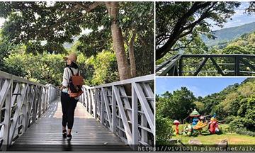話說步道途中會經過二座迷你的索吊橋,吊橋入口清楚說明「限載2人」字樣,大家乖乖遵守規定,然後依序排隊等待走過索吊橋,著實有趣!