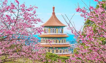 粉色櫻花配上繚繞的雲霧與藍天~強烈對比宛如一幅畫一樣