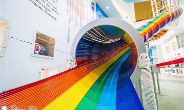 看似普通的投籃遊戲,一摸籃球才發現是輕飄飄的皮球,要投進籃筐還需要用上比較大的力氣,也要避免他隨風飄逸影響拋物線