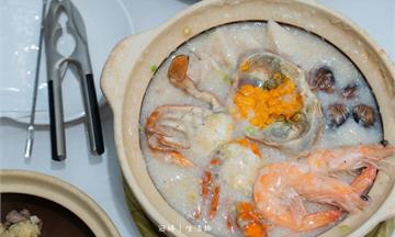 以優選高品質白米、水為基底,加入殺青處理乾淨的紅蟳熬製海鮮粥,經過時間、火侯淬鍊,紅蟳精華化於湯中,與加入白蝦、蛤蜊、瑤柱、手工花枝丸等海鮮食材增加鮮味層次;其中還加了一味美味秘方:堅果醬提升整體風味,最後灑上芹菜末、胡椒粉,美味上桌!