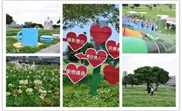 大台北都會公園,白花三葉草如雪綻放,騎車散步賞花海,親子同樂,幸福水漾公園彩蝶飛,告白廣場傳情:要幸福哦!