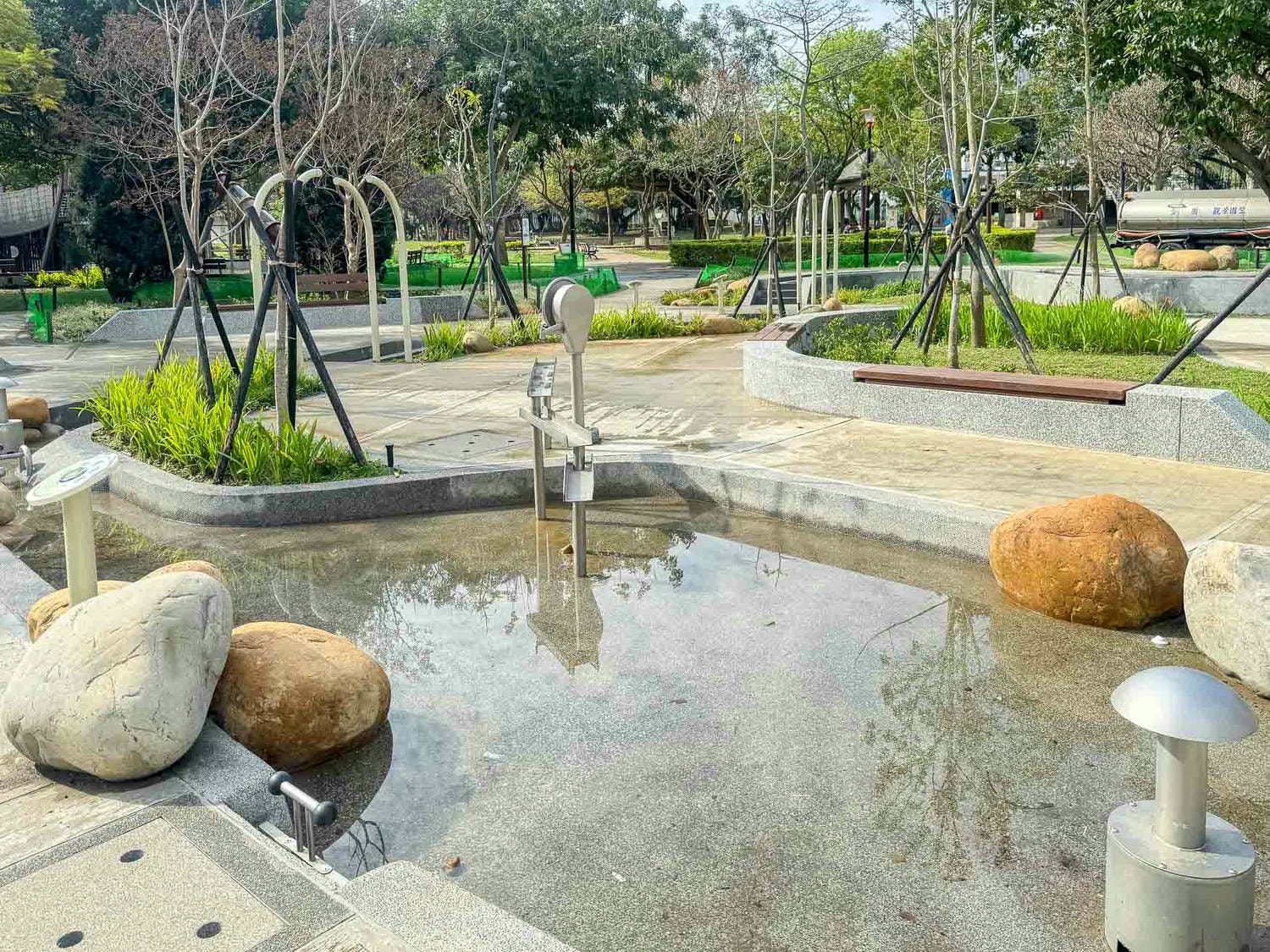 水樹遊戲島是呼應舊時村民溪邊玩水的情景,以溪流為意境打造這處遊戲地景。
