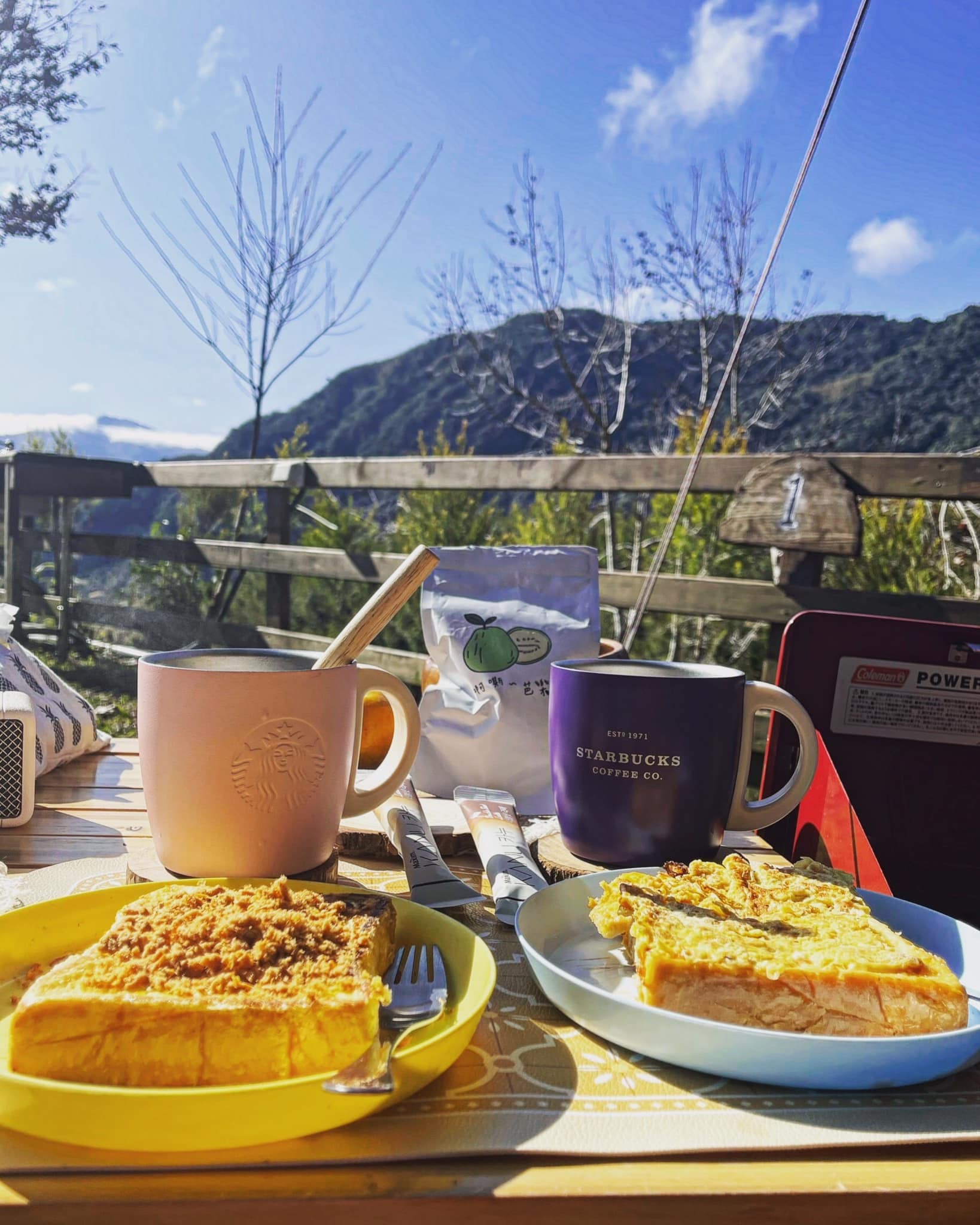 我們面對遼闊山景,愜意的享用露營早餐