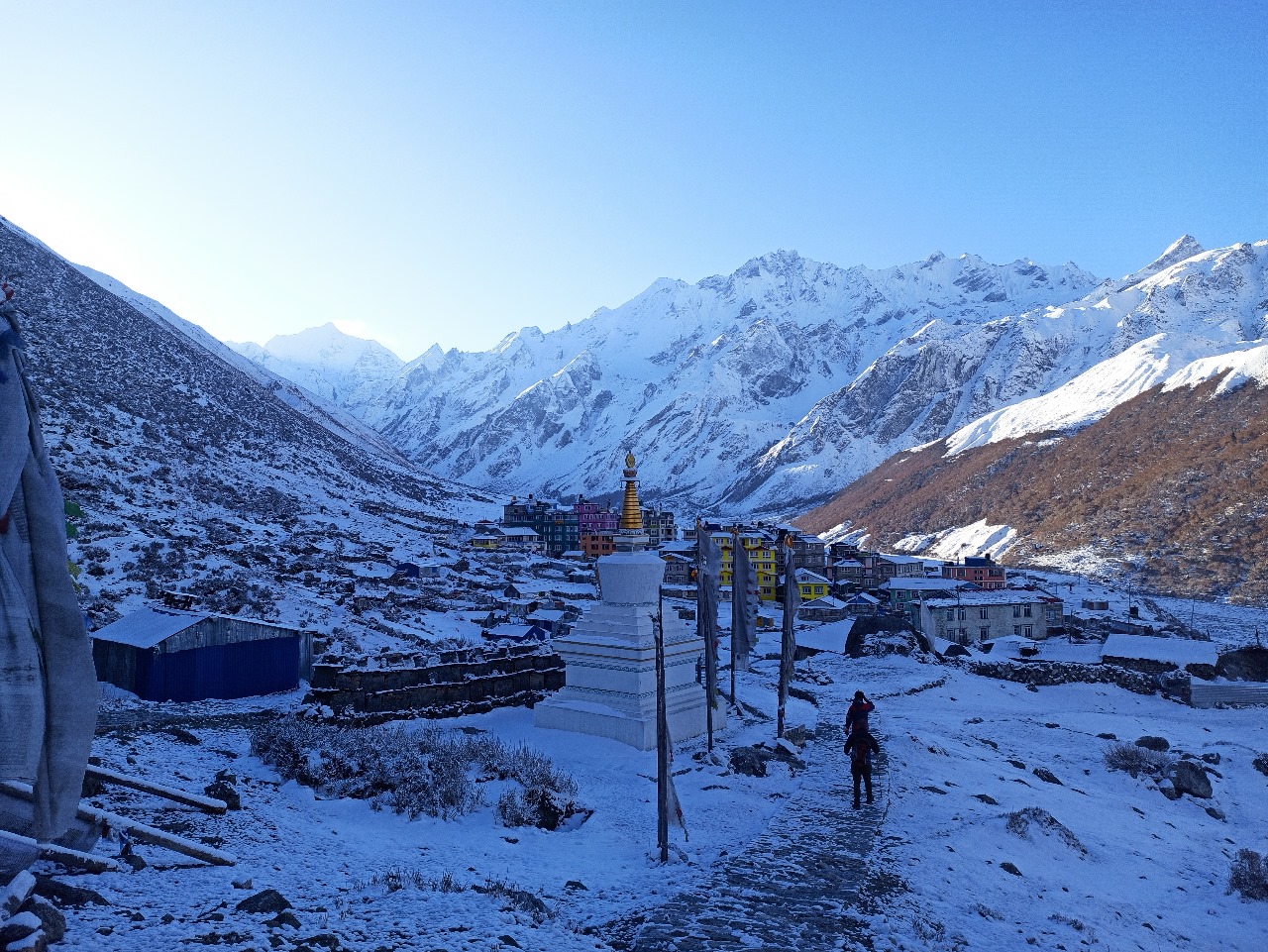 The Langtang Valley Trek starts from a place called Syabrubesi, which is about a 7-hour drive from Kathmandu. The whole trail is about 65 to 75 kilometers long. It takes you through green forests, small villages, and wide mountain views. I saw rivers, yaks, and even monkeys along the way.