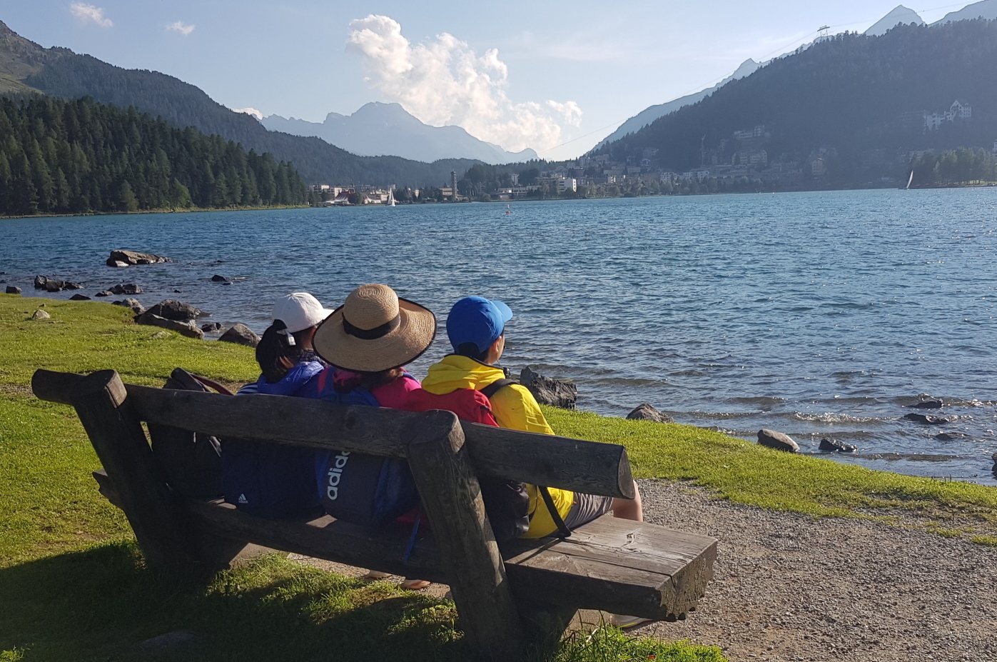第一天:從「庫爾」搭乘「伯連納列車」抵達「聖莫里茲」時已近傍晚,瑞士夏季近十點才天黑,因此可悠閒坐在湖邊,欣賞黃昏時分「聖莫里茲湖」的美景。