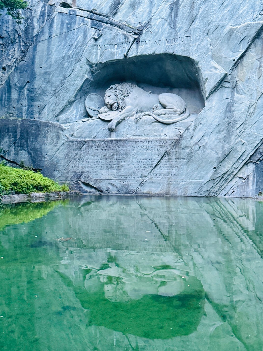 「獅子紀念碑」在懸崖岩石上精緻雕刻一隻悲傷的獅子,是紀念法國大革命中,保衛皇宮而喪命的瑞士傭兵,美國文豪馬克·吐溫形容它是「世界上最令人悲傷且感動的石像」,讓後人緬懷這段悲壯忠誠的歷史,是世界遊客必訪的瑞士地標。