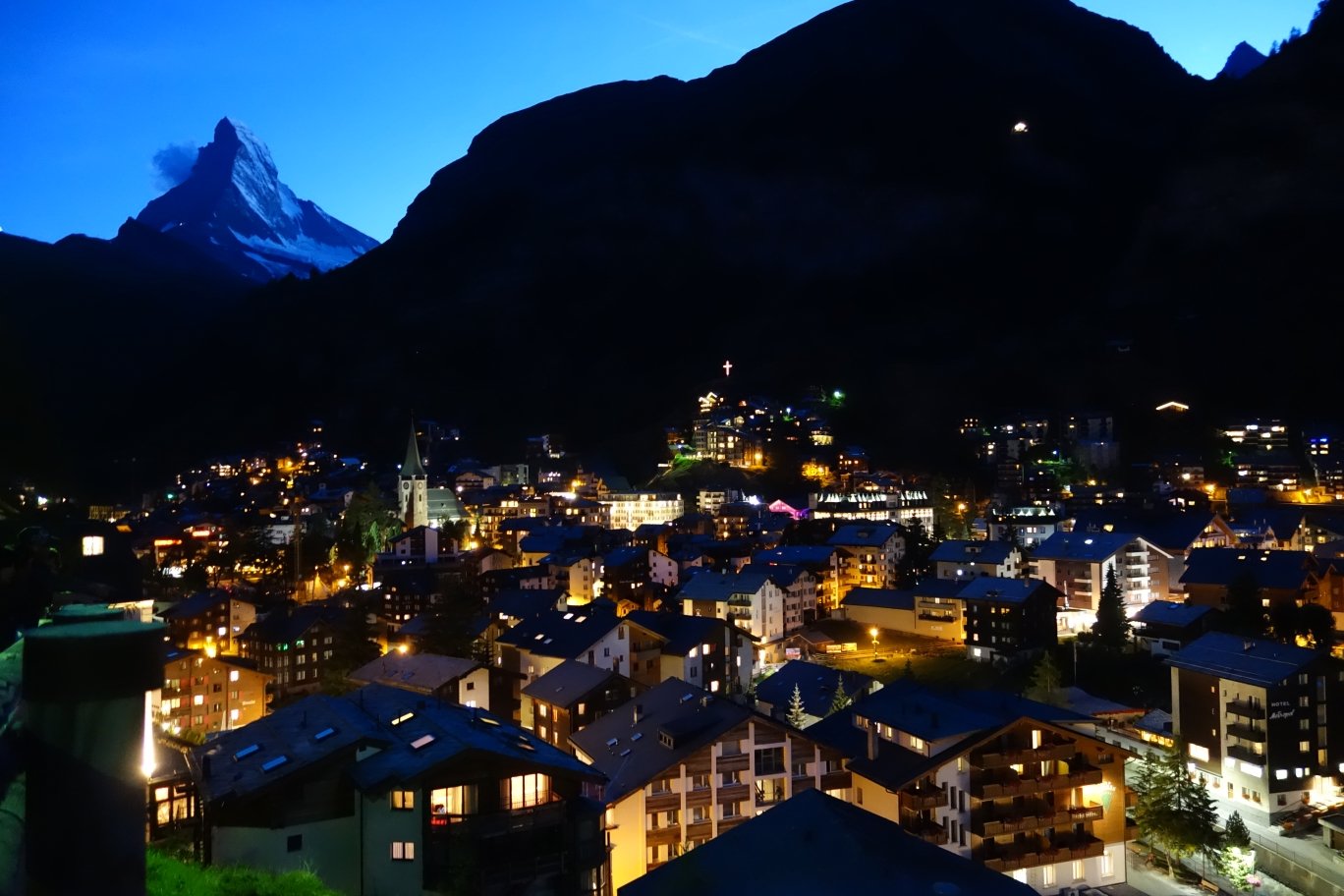 第一天:從「盧加諾」抵達「策馬特」已近傍晚,夜晚的小鎮點點燈火與黑夜中顯得孤寂的「馬特洪峰」形成強烈的對比,夜景之美讓人駐足不忍離去。