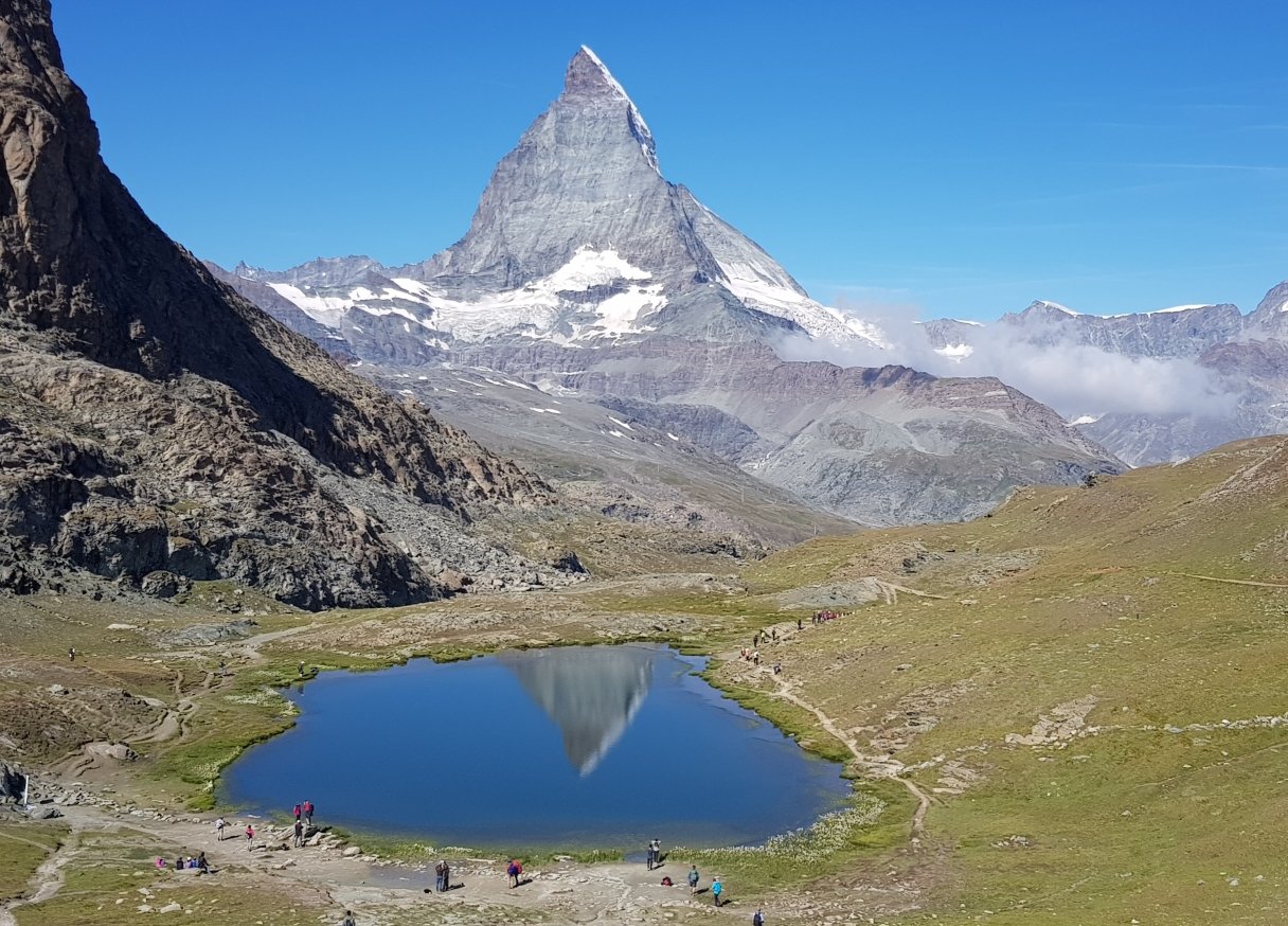 接著下坡前往馬特洪峰,沒想到馬特洪峰前面的山谷有一個高山湖泊,實在太令人驚艷了!晴天時湛藍無比的湖面倒映著馬特洪峰,景緻美到讓人不想離開,好想放空賞景一整天