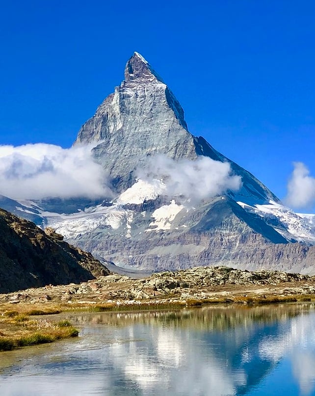 馬特洪峰位於瑞士與義大利交界的阿爾卑斯山脈,標高4,478公尺,不同於其他山峰,四面坡度幾乎呈垂直,陡峭山體不易積雪,造型特殊像一座金字塔,被稱為「阿爾卑斯山之王」,是瑞士的經典地標,也是世界深具辨識度的山峰。