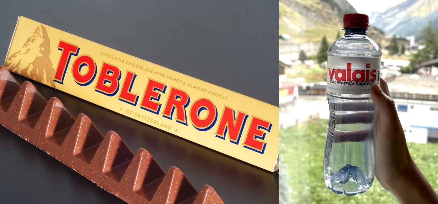 馬特洪峰是瑞士的象徵,著名的三角型巧克力「Toblerone」包裝上就有馬特洪峰的圖案,還有「valais」礦泉水的底部也有馬特洪峰的造型設計呢!