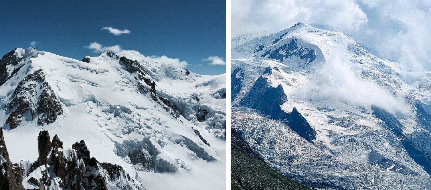 這是不同季節在南針峰觀景台看到的白朗峰,白朗峰沒有固定的山形,因為山頂積雪厚度會隨季節及氣候變化而增加或減少,冬季山頂看起來圓潤,夏季冰雪融化岩石露出線條變得銳利,山頂強風也會不斷重塑雪冠,加上視角不同也會有差異