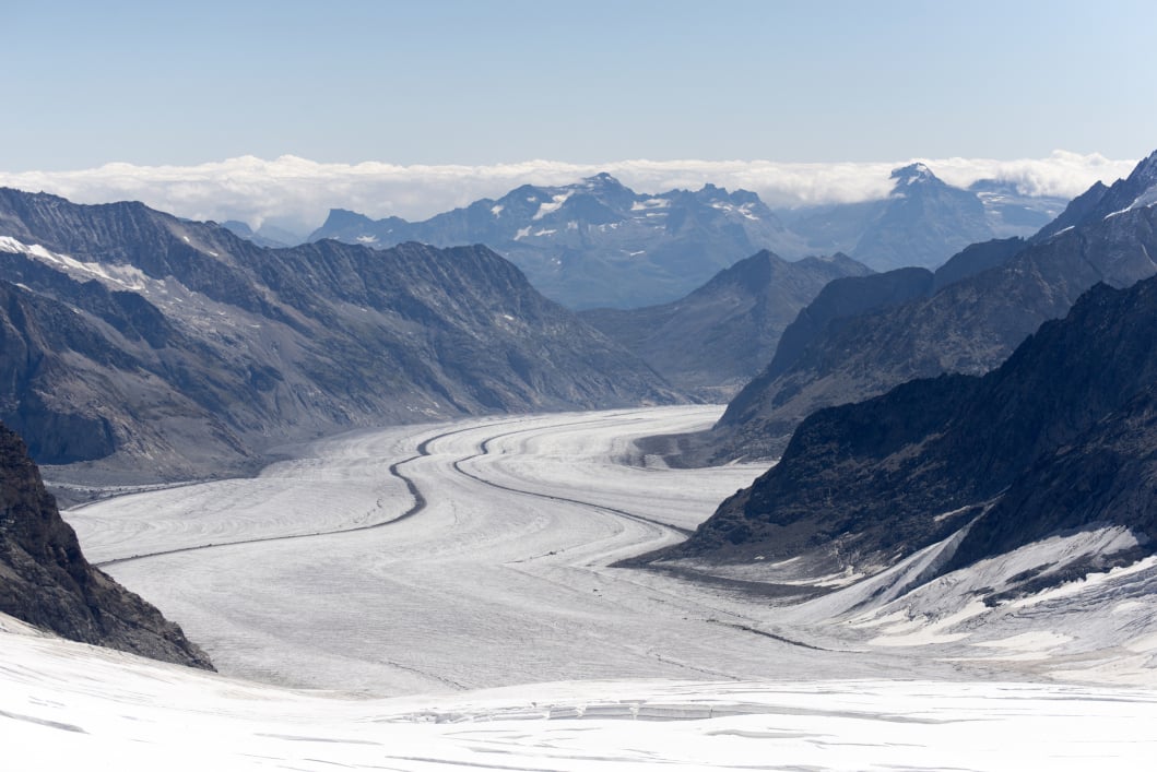 少女峰北坡險峻南坡緩和,阿萊奇冰川就從少女峰南側延伸,是阿爾卑斯最長的冰川,長達23公里