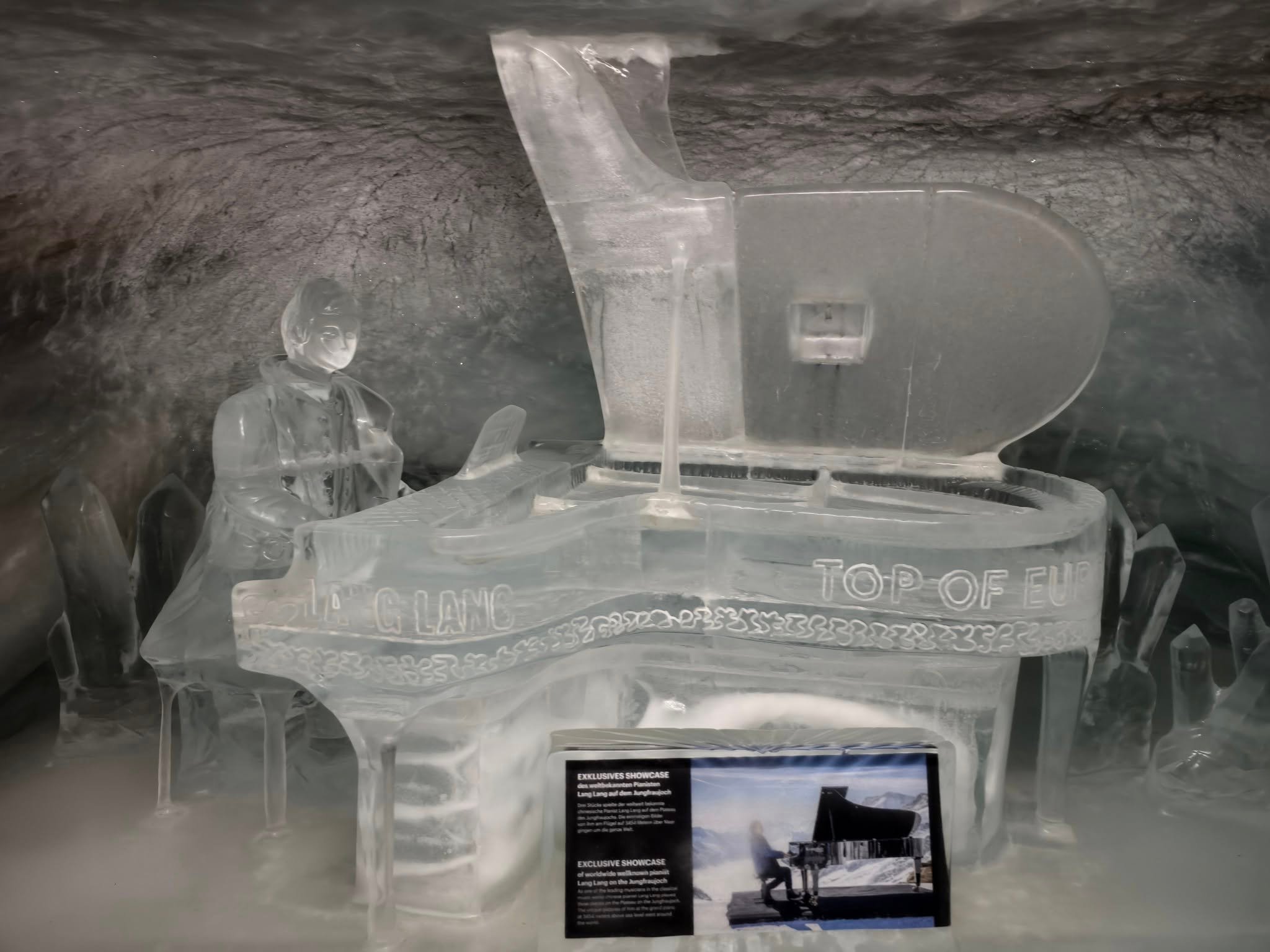 冰宮內有各種冰雕作品,其中鋼琴家郎朗的冰雕像是旅客必拍的亮點,紀念他於2022年在少女峰車站舉辦戶外音樂會。這裡長年要維持低溫才能確保冰雕不會融化,因此彷彿身處在一個大冰庫啊!