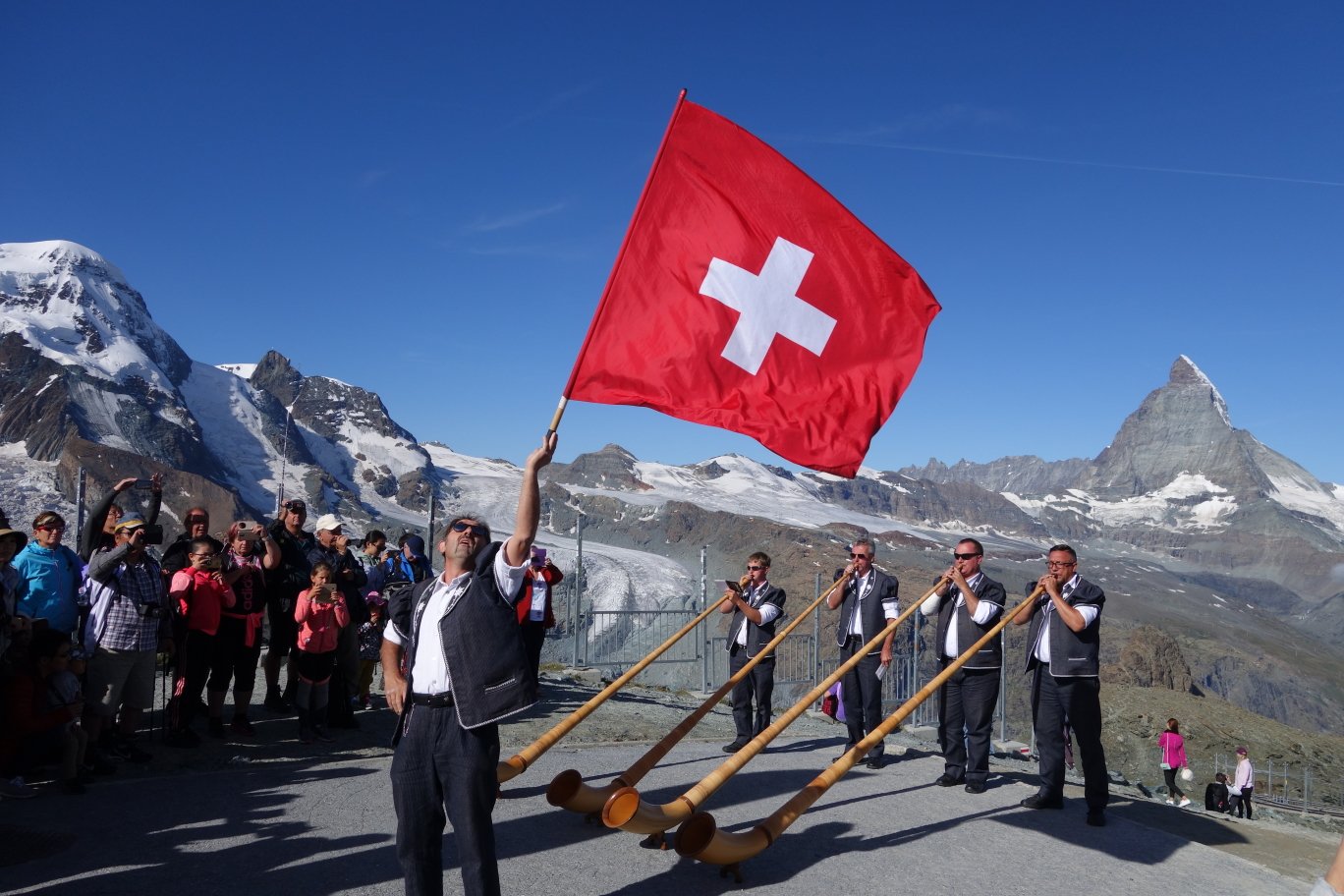 下山時,在火車中途站看到樂隊在吹奏「阿爾卑斯號樂器」,最初並非是吹奏樂器,而是牧人在山谷間傳遞訊息及召喚牛群,聲音渾厚低沉帶有山谷回音,傳送距離可達數公里,是瑞士文化的象徵