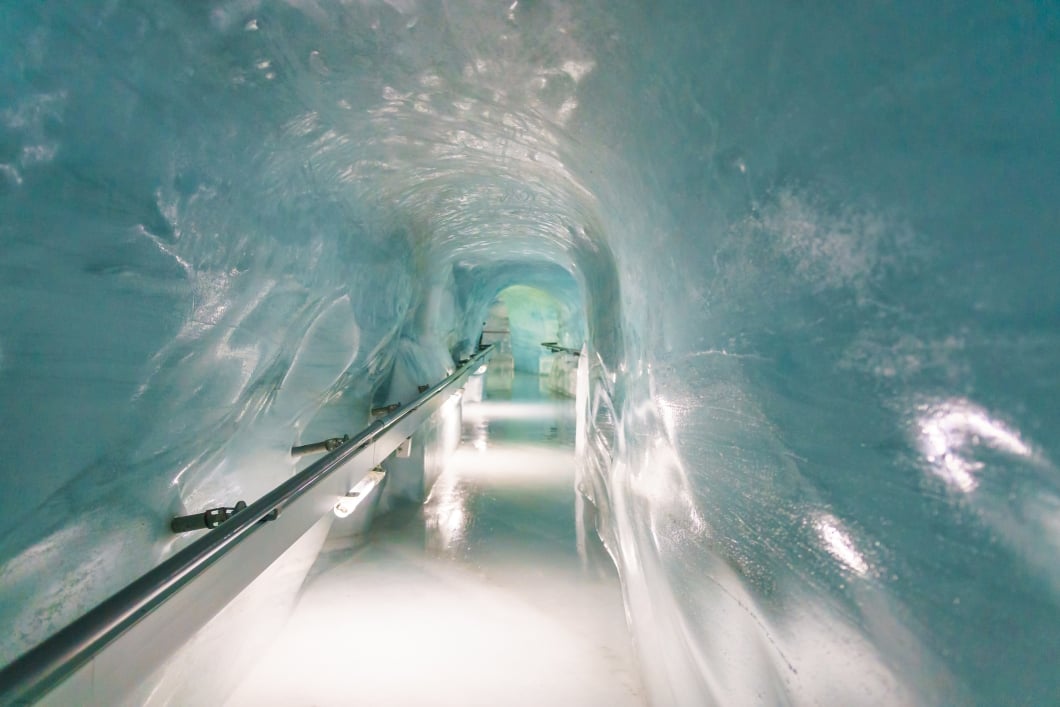 這是通往冰宮的通道,冰宮位於少女峰車站下方約30公尺的冰川永凍層中,是登山客於1930年以冰錐與鋸子開鑿的冰雕通道,此處地面超滑,一定要扶著欄杆緩步前進,不然很容易滑倒