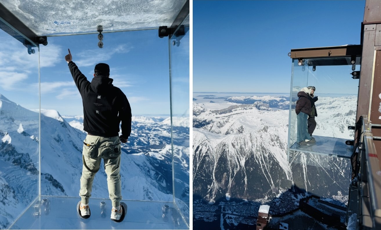 南針峰山頂的觀景台有一個透明的玻璃屋,玻璃超乾淨可清楚看見距離3842公尺的地面,站在上面好像飄浮在空中,看看遊客敢不敢挑戰膽量,懼高症的人站在裡面應該會腿軟
