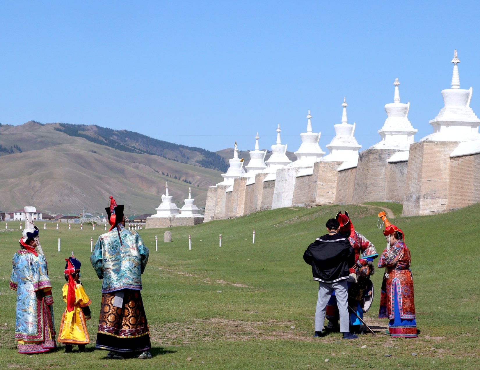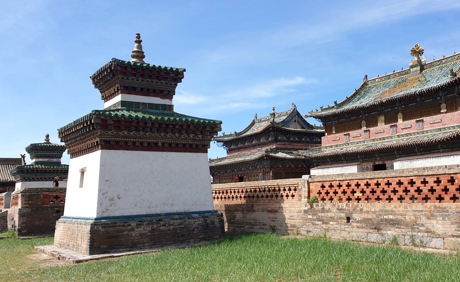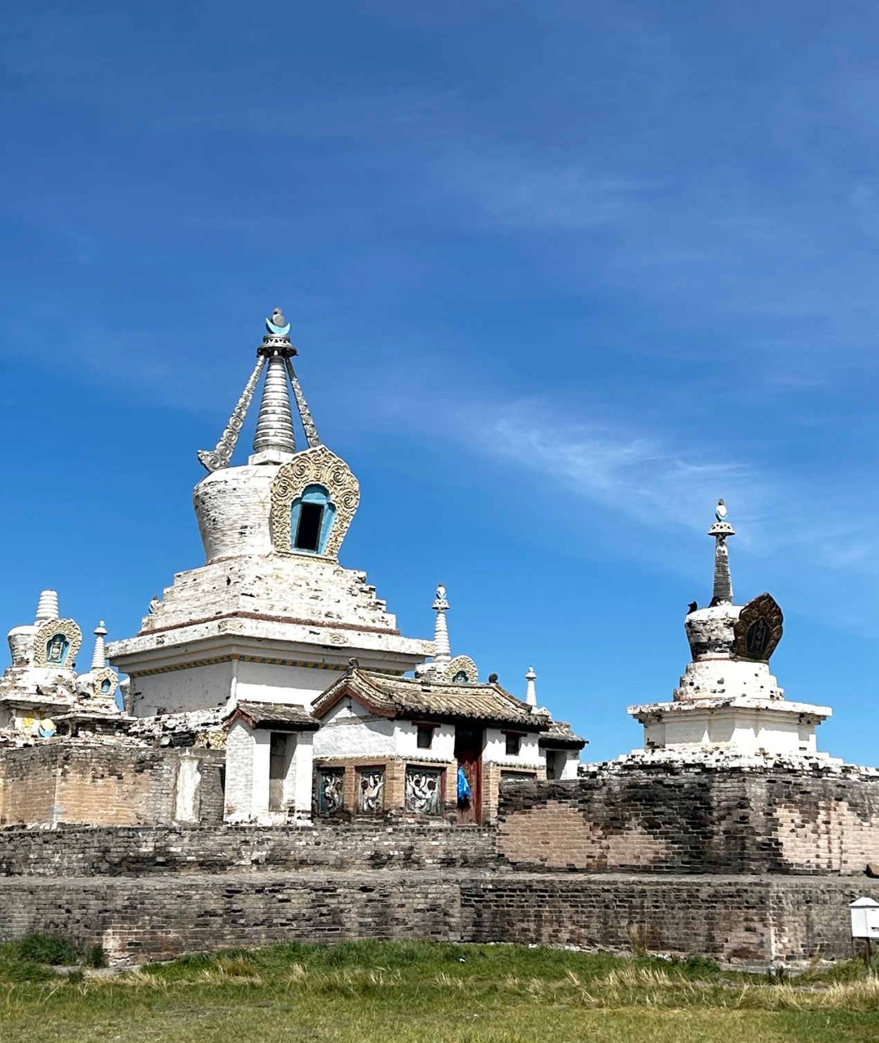 院內「額爾德尼召寺」的中央是一座大型白色佛塔,四周環繞小型佛塔,造型帶有藏傳佛教與蒙古特色,是蒙古最古老的喇嘛寺廟,反映蒙古族從遊牧文化走向佛教文明的轉變,至今仍是蒙古人參拜、祈福的重要聖地。