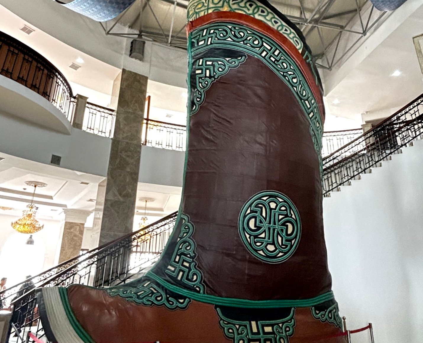 雕像的基座是小型的博物館,一樓入口處有一個巨大的馬靴,高約9公尺,重達數噸,是世界上最大的傳統蒙古馬靴模型。成吉思汗征戰時,依靠堅固耐用的馬靴才能征伐四方,馬靴象徵蒙古人「腳踏實地邁向世界」的精神,鞋尖上翹寓意「不踐踏大地的生靈」。