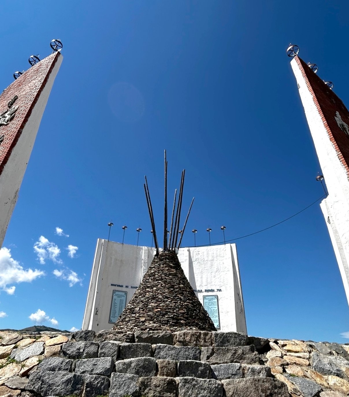 三塊紀念牆中央有一個裝置藝術,由石頭堆砌而成的圓錐形底座,上方插有數根金屬杆,象徵蒙古帝國的旗幟和長矛,展現蒙古民族的力量和團結,很具藝術感。此處也是俯瞰整個哈喇和林的最佳地點。