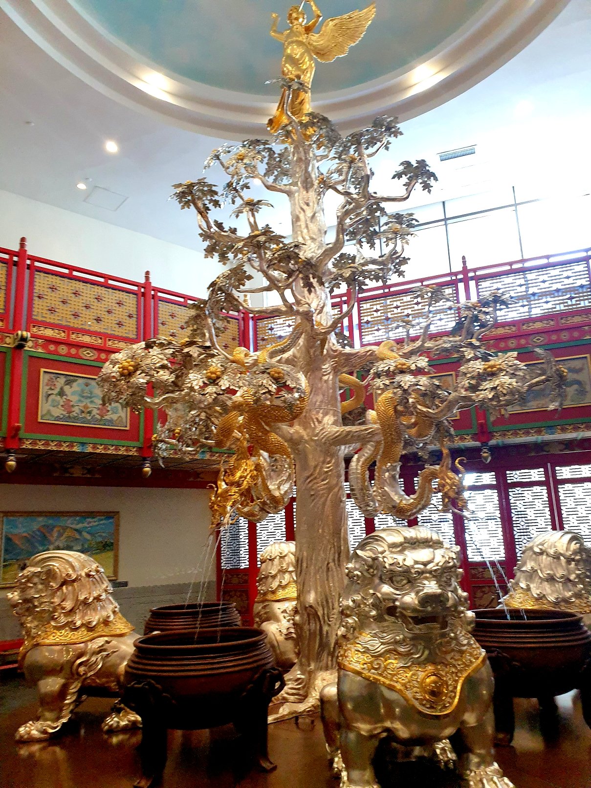 館內這棵許願樹很特別,融合中西方文化,樹頂站著一個西方形象的金色天使,銀色樹幹和樹枝上纏繞著金色的龍,嘴巴噴水到下方的香爐中,樹的周圍有四個銀色的獅子,可供人祈福許願。