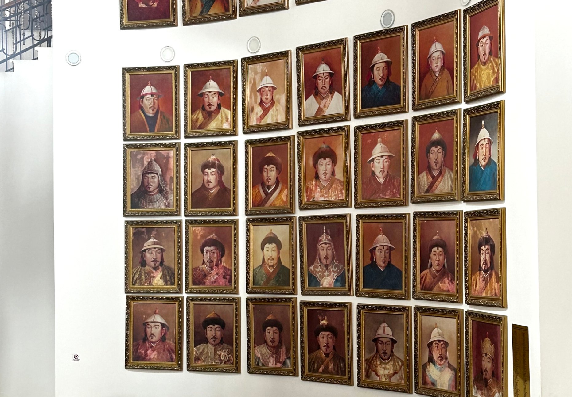 馬靴旁是「歷代君主畫像牆」,有成吉思汗到後世分支汗國統治者的畫像,他們身穿錦袍,頭戴蒙古傳統帽飾,展現威嚴與民族特色。