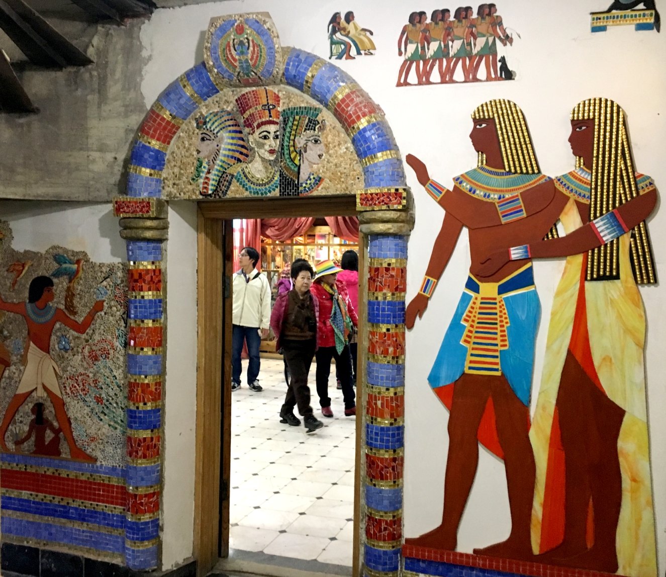 這是「古埃及宗教文化廳」的一角,牆壁與門框上裝飾了大量仿古埃及的壁畫與馬賽克,讓參觀者感受不同文化的藝術。