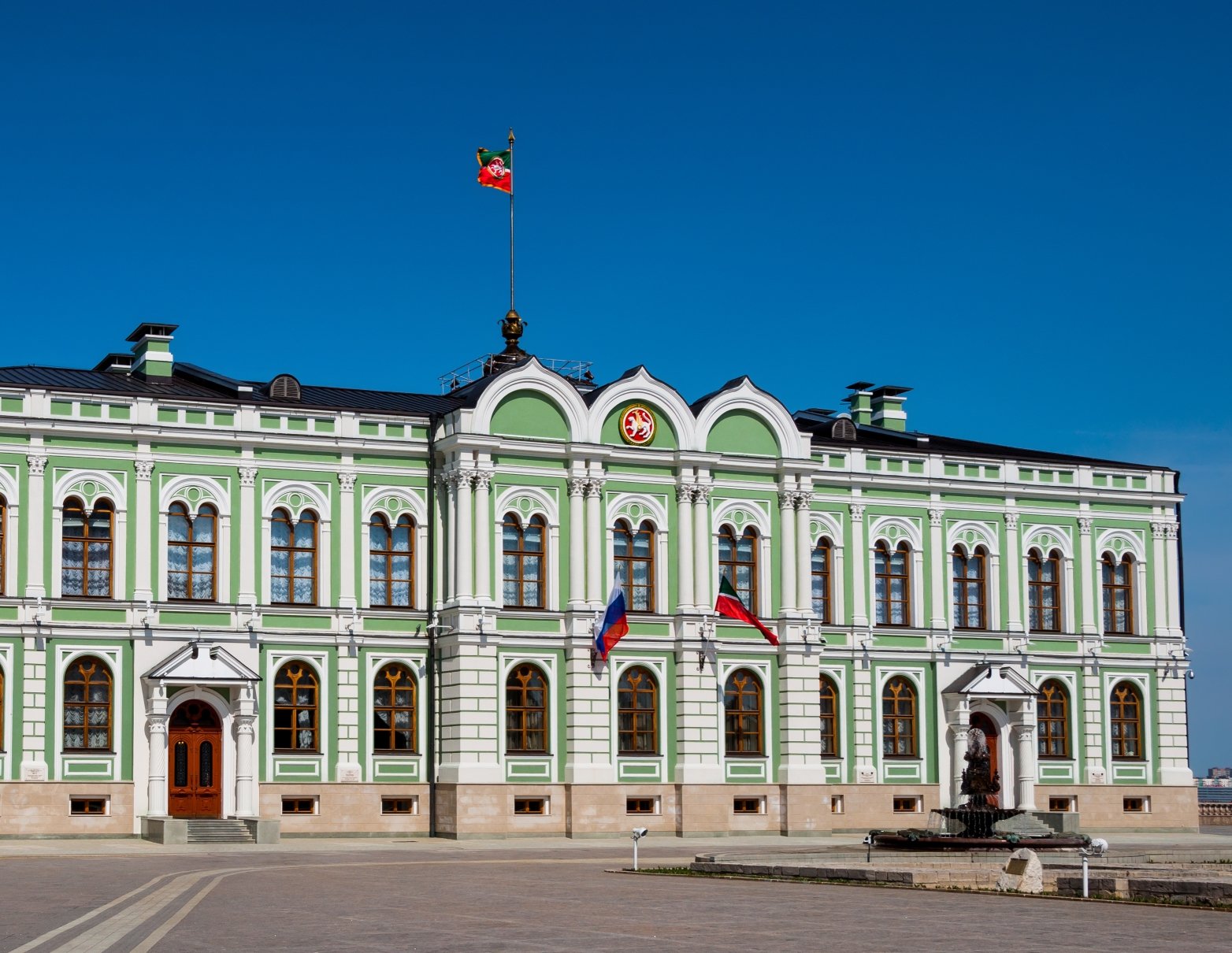 「韃靼斯坦共和國總統府」是喀山克里姆林宮的政治建築,前身是喀山汗國的宮殿,沙皇伊凡雷帝征服喀山後,舊宮被拆除,改建為俄羅斯軍事與行政機構,之後經過多次重建,才成為現在的總統府。白色外牆對稱式立面,帶有宮殿氣派,是典型俄羅斯古典主義的建築風格。