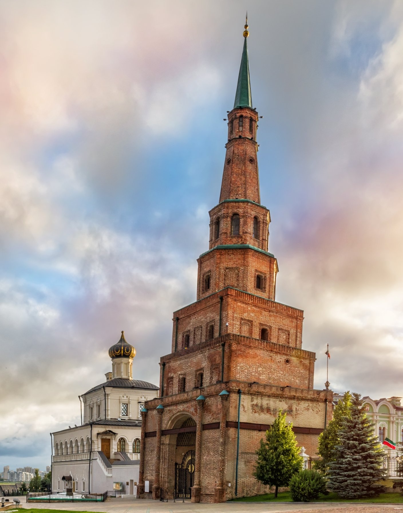 「蘇尤姆别卡塔樓」位於喀山克里姆林宫正中央,融合了俄羅斯巴洛克與東方伊斯蘭風格,高約58公尺,分為七層,逐層收窄頂端成尖塔,塔頂朝東北方傾斜了1.9公尺,與義大利比薩斜塔齊名。傳說蘇尤姆别卡是喀山最美麗的王后,沙皇伊凡雷帝攻克喀山後強娶她,在婚禮前她從塔頂跳下殉國,成為喀山汗國滅亡的歷史記憶。