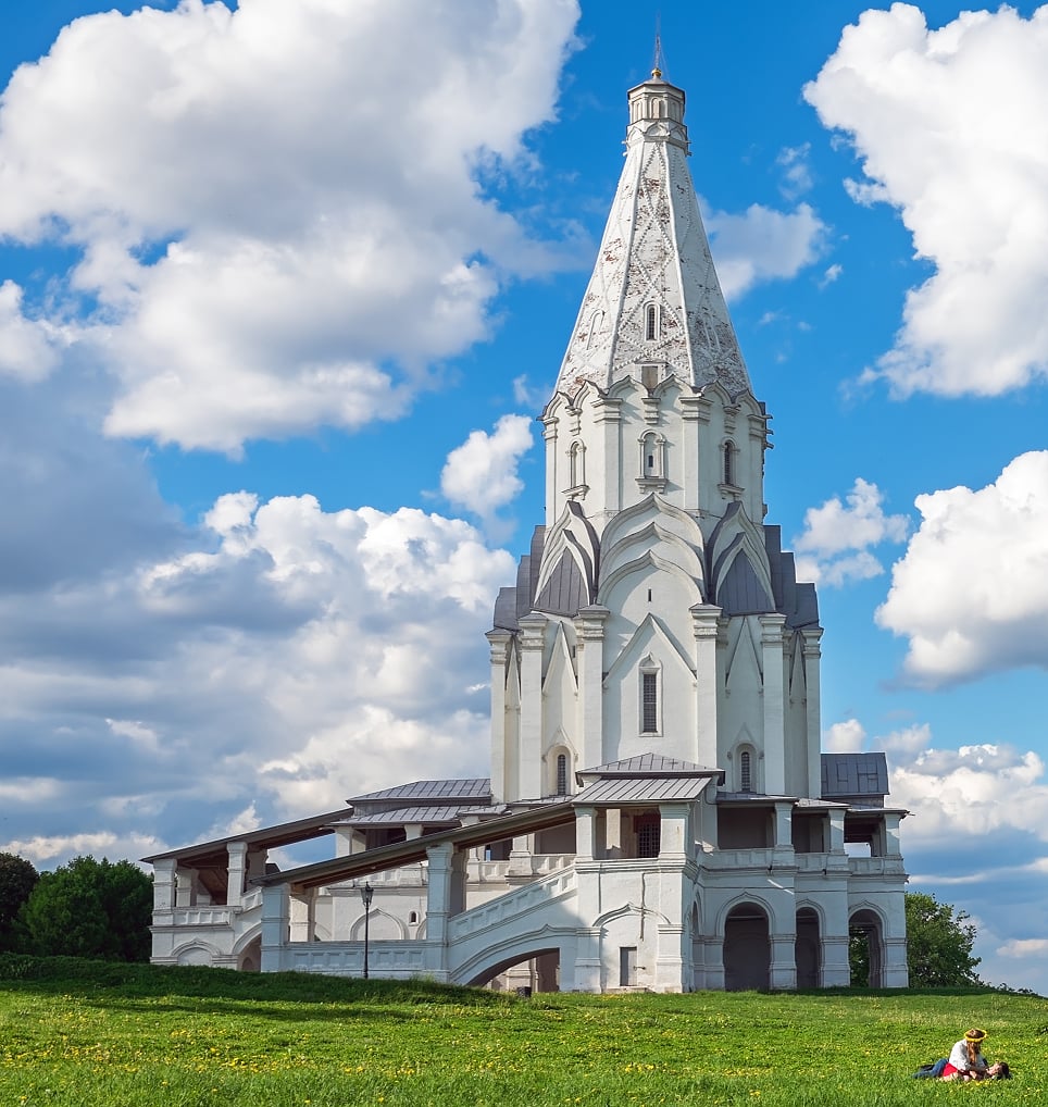 「耶穌升天教堂」是為慶祝伊凡雷帝誕生而建,打造俄羅斯第一座石造帳篷式尖塔教堂,是俄羅斯由傳統木造邁向石造建築的轉折。外觀猶如一座白色石塔,打破了傳統拜占庭式的圓頂設計,象徵基督升天靈魂向上攀升。
