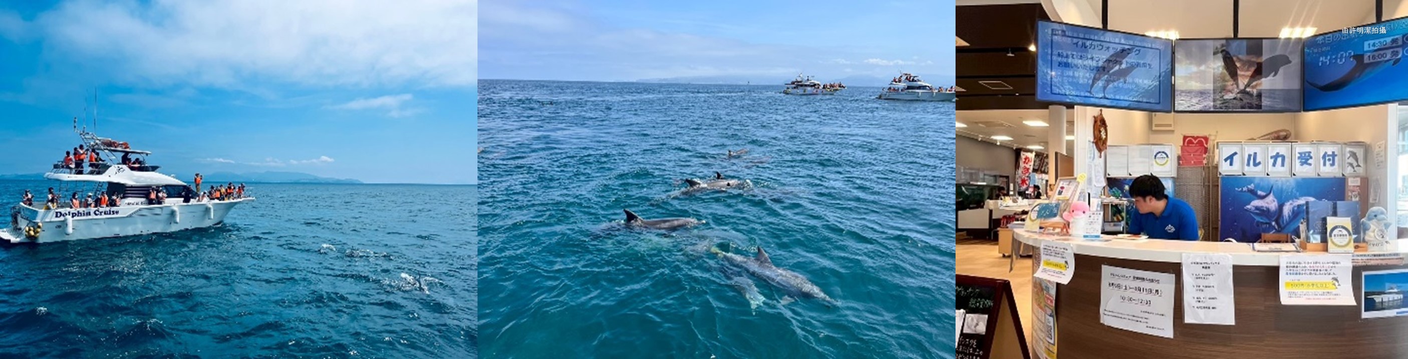 來天草不管一年四季最主要就是來體驗賞海豚! 因天草一年四季溫暖氣候,熊本天草諸島近郊一年四季棲息著南半島海豚。一天共有五班船,分為早上二班,下午三班,建議事前預約確保可以搭乘,以及15分鐘前至道之驛站 天草市海豚中心櫃台領票。