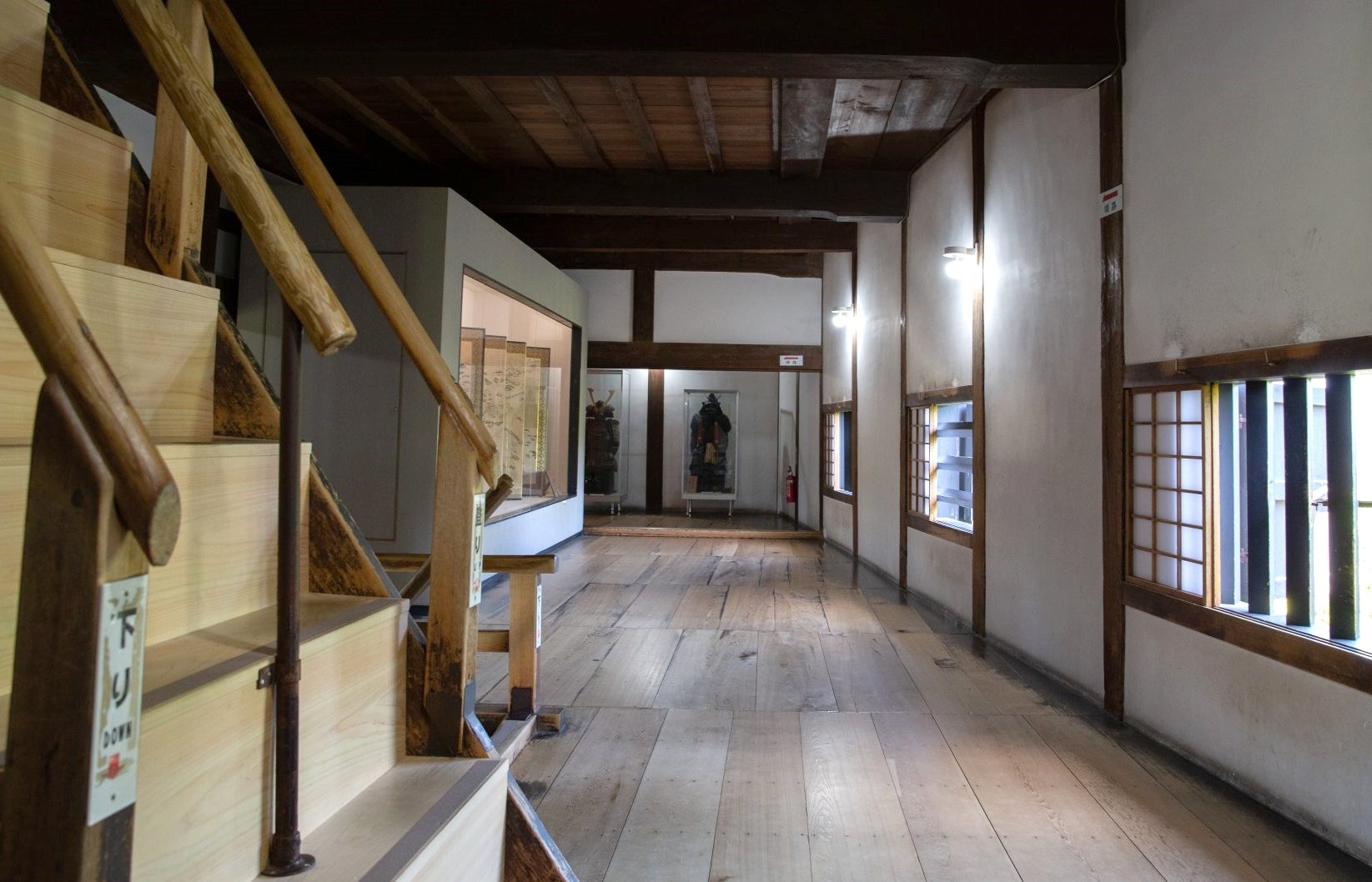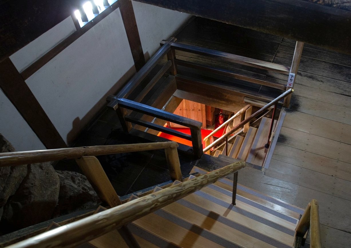 天守的特色是樓梯很陡、門很低,空間十分有壓迫感,原因是為了方便防守,不讓敵軍快速移動,完全是為了戰鬥而設計。內部展示品不多,目的是想保留原始結構,讓旅客體驗建築本體,強調「空間」本身就是文物。