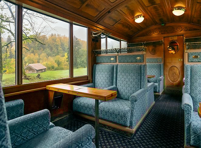 巴士團的黃金列車是「黃金快線」一等艙,乘坐約3小時的直達火車到茵特拉根,知名球王羅費德勒(Roger Federer)曾出現在瑞士國家旅遊局的推廣影片中,讓更多觀光客認識這條鐵道。