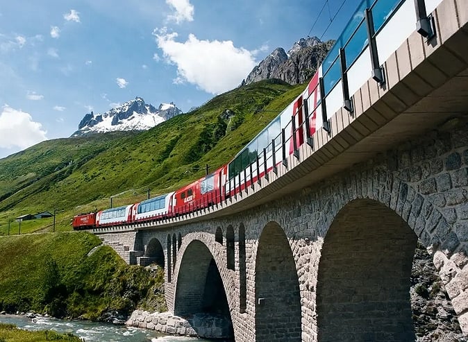 瑞士60%以上是阿爾卑斯山地形,高山公路行駛危險,鐵道相對安全可靠,因而成為瑞士的交通骨幹,為發展觀光還設計多條「觀光景觀列車」,全景車窗與低速行駛,路線刻意經過湖泊、冰河與牧場等,讓旅客坐火車就能輕鬆盡覽瑞士美景。