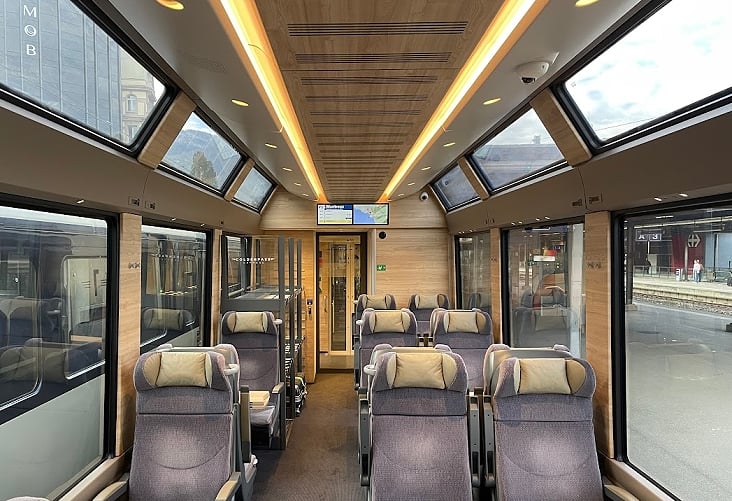 列車最大的特色是採用全景天窗設計,讓人感覺置身在大自然的懷抱裡,可放空欣賞窗外的山光水色,任由發呆走神,回神依然隨時有美景,這種不用擔心錯過景點的心情,讓時間變慢了,心情也隨之放鬆,是瑞士最受歡迎的觀景列車。